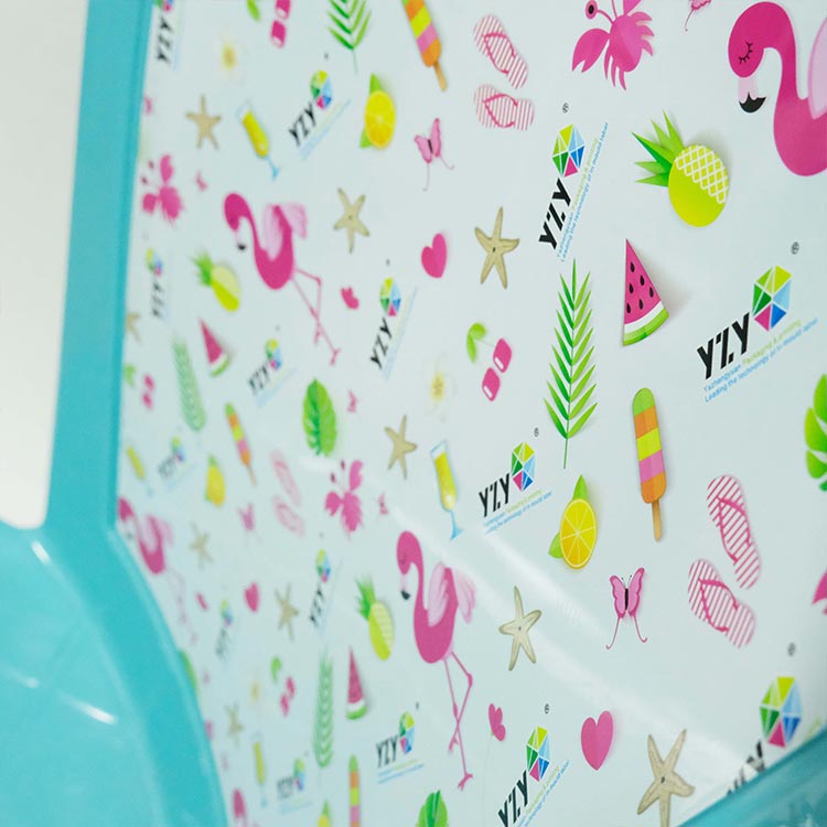 وبعد عدة مناقشات واختبارات، تم اعتماد مخطط تزيين الأجزاء في نهاية المطاف. قامت YZY فقط بتطبيق قالب حقن البلاستيك القابل للتكديس في ملصق القالب في المنطقة الأساسية لظهر الكرسي، الأمر الذي لم يتجنب فقط التعب البصري الناجم عن الطباعة واسعة النطاق ولكن أيضًا عزز القدرة التنافسية المتمايزة لمنتج العميل من خلال اللمسات الزخرفية. كان تخطيط أنماط التصميم كثيفًا ومتفرقًا بشكل مناسب، وفي الوقت نفسه، تم دمج شعار العلامة التجارية للعميل وأنماط التصميم، مما حقق الوظائف المزدوجة للديكور ونشر العلامة التجارية. بالمقارنة مع أدوات المائدة الصغيرة، فإن ملصقات IML لكراسي YZY تستخدم غشاء مركب PET/PP سميك، والذي يجمع بين المتانة ومقاومة درجات الحرارة العالية، وهو مناسب للقولبة بالضغط العالي في القوالب الكبيرة. يتميز ظهر الكرسي بهيكل منحني، ويجب تشكيل الملصقات مسبقًا بشكل ثلاثي الأبعاد لتتناسب مع انحناء القالب. يمكن لعملية IML تحقيق درجة عالية من التوحيد لأنماط المنتجات العالمية، بالإضافة إلى التصميم المقاوم للطقس، ويمكنها تلبية متطلبات الأسواق الخارجية.